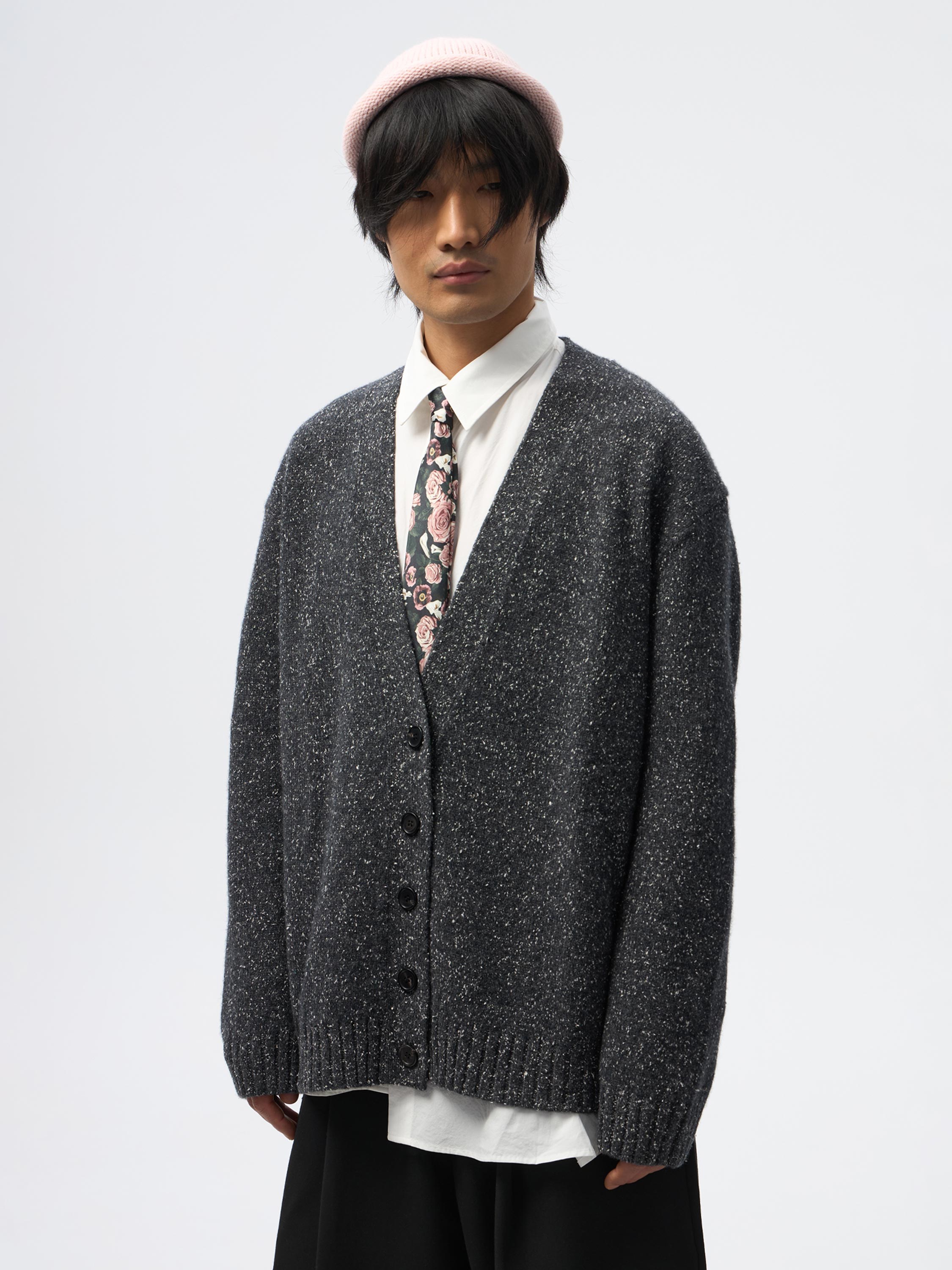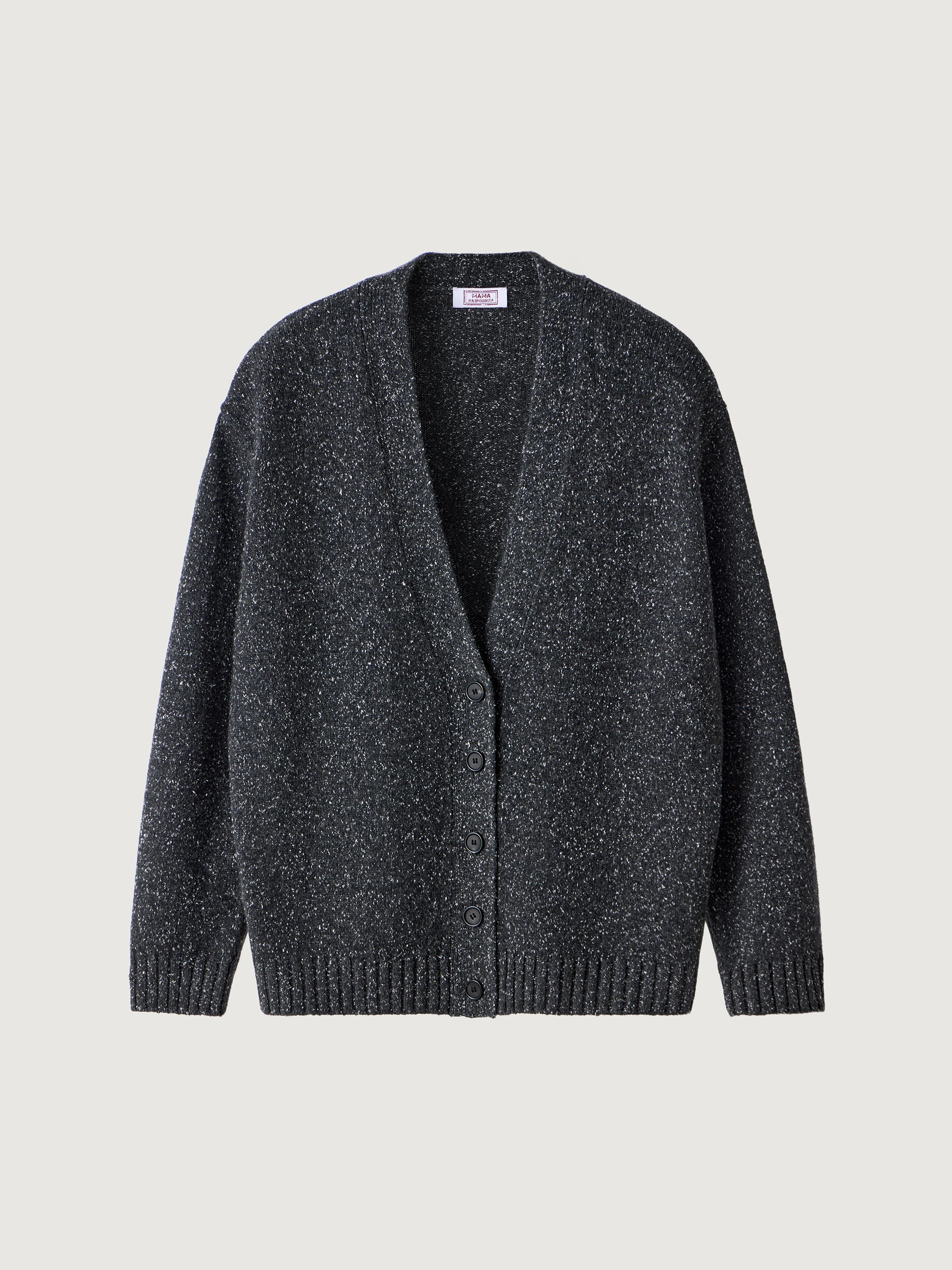 Комфортный кардиган связан из нежнейшей фактурной пряжи — неоднородного серого оттенка с вкраплениями молочной нити.