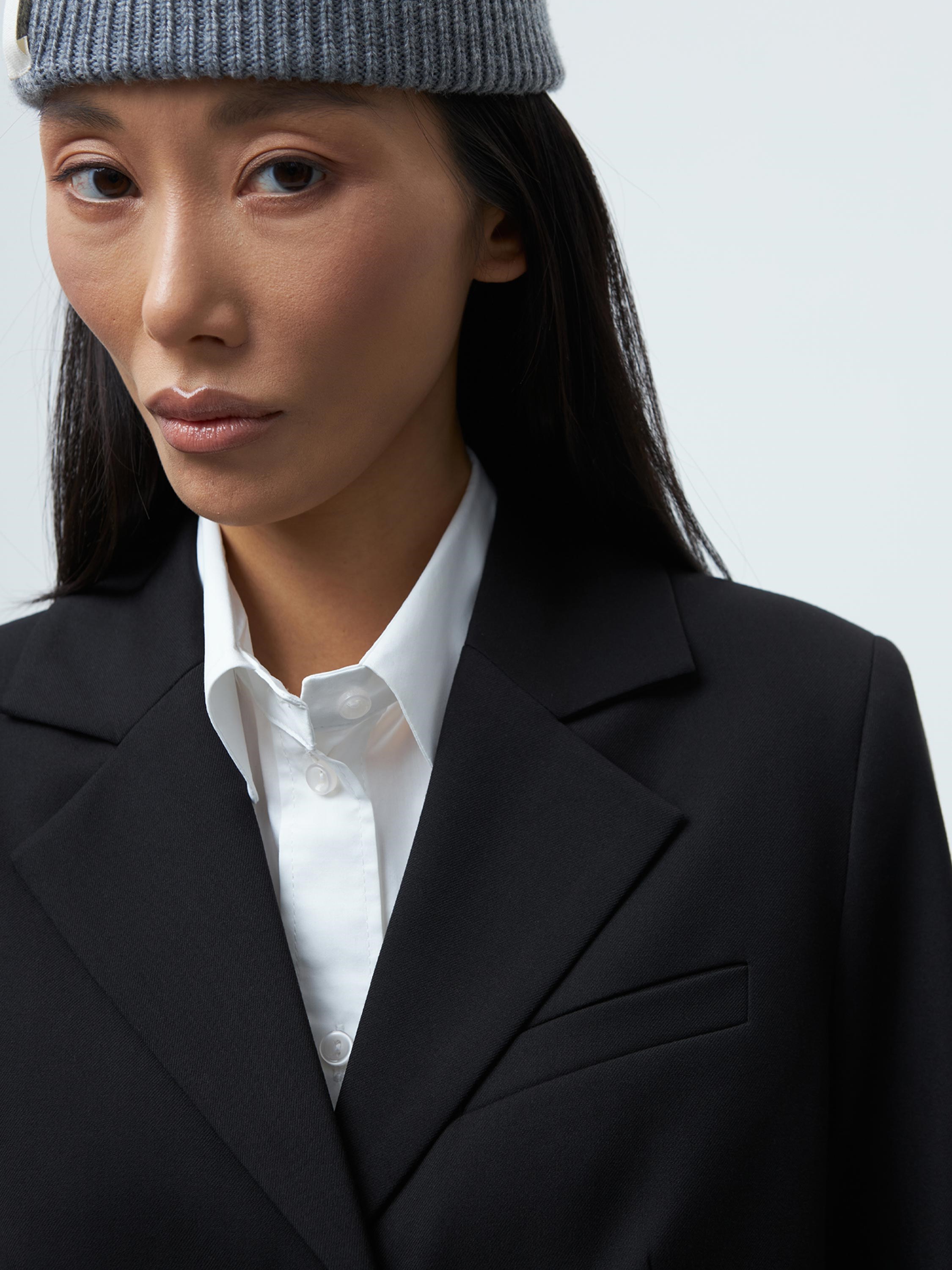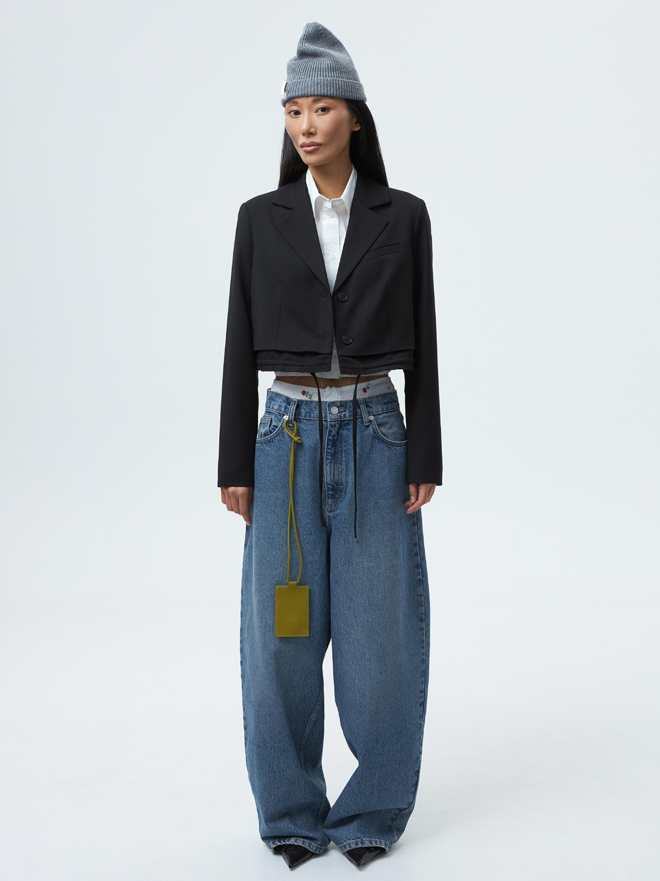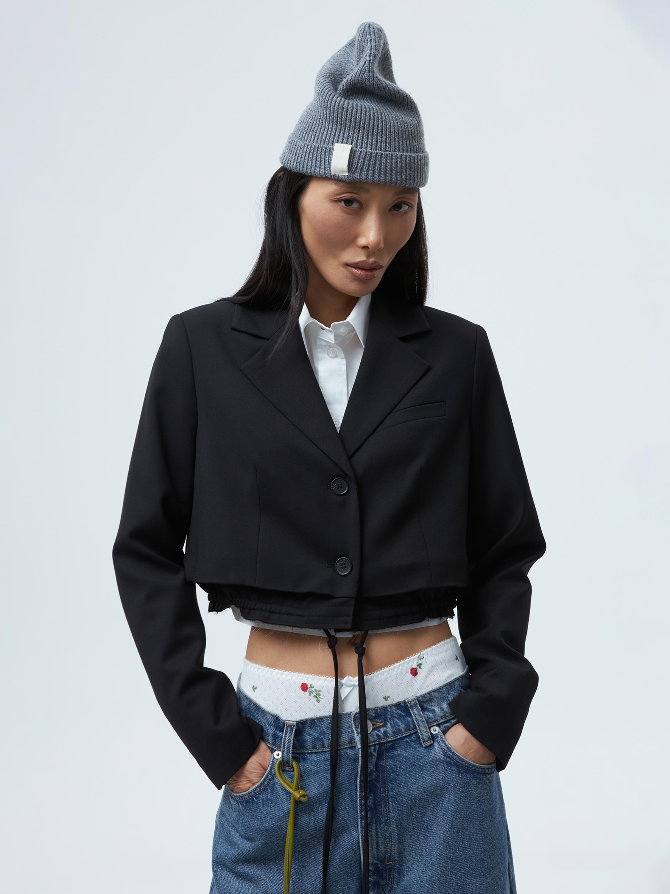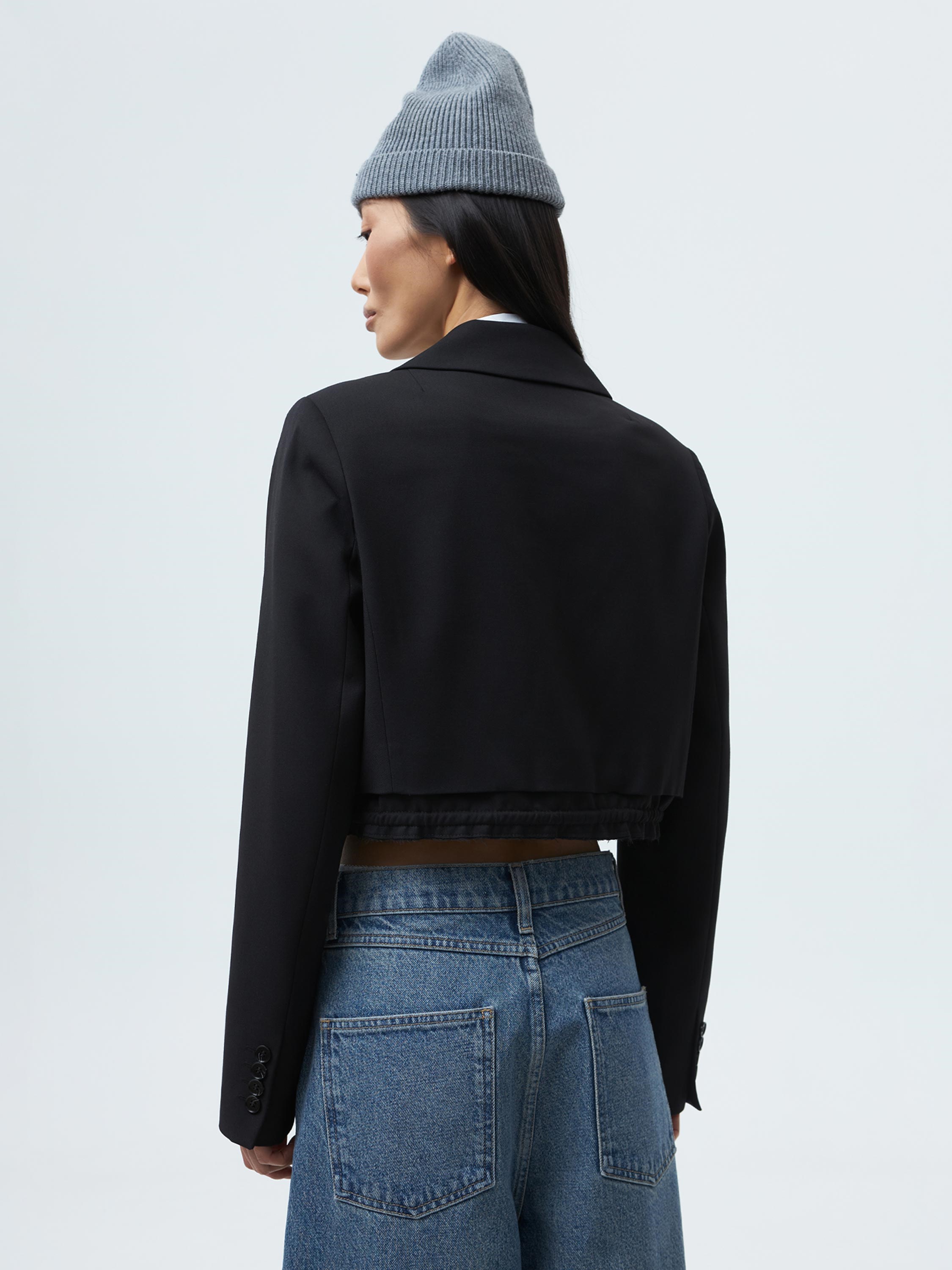 Кроп-жакет из костюмной ткани со сборкой снизу.