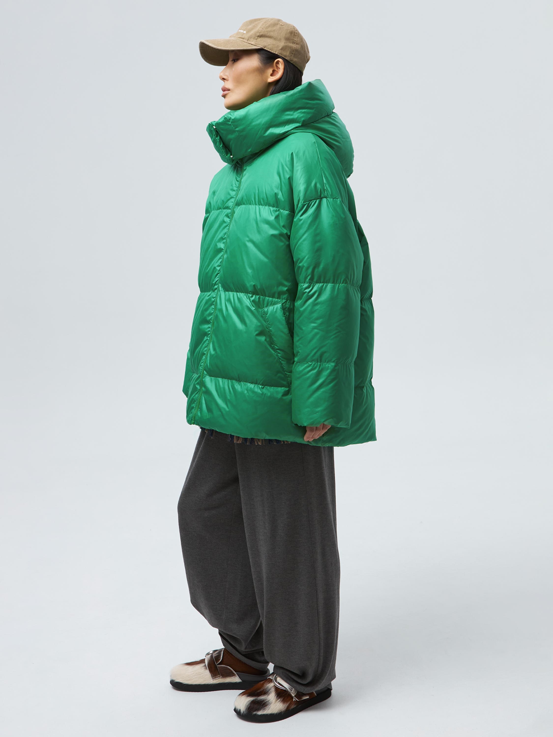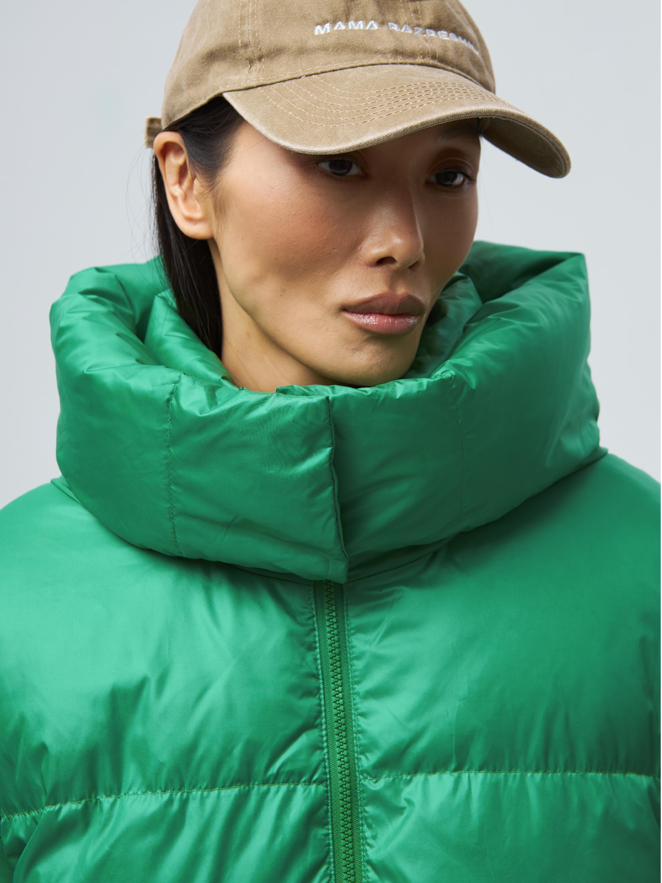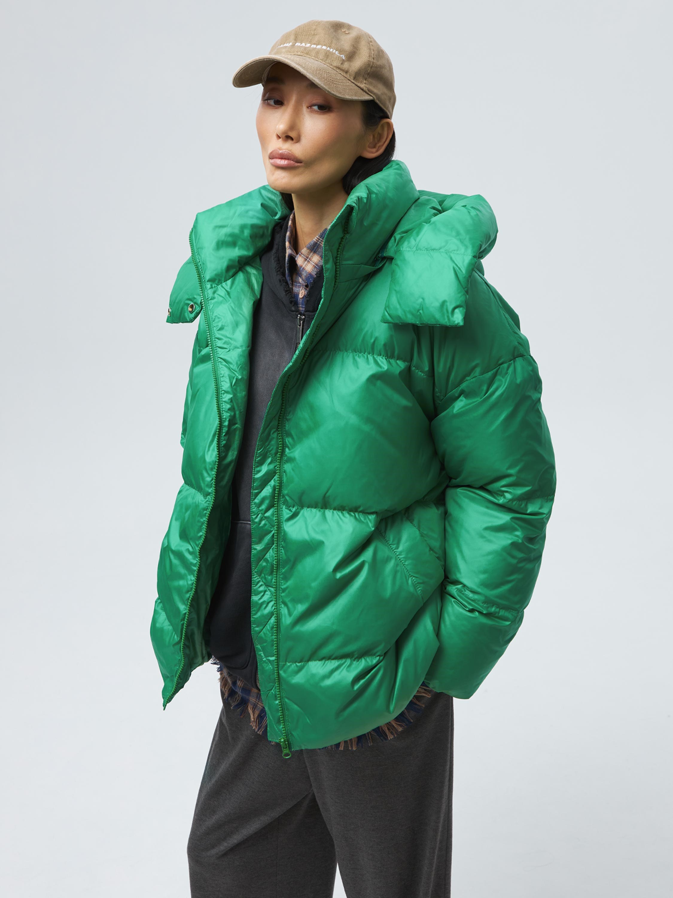Модный пуховик из тонкой плащевой ткани (без дополнительного эффекта водоотталкивания) с отстёгивающимся капюшоном.