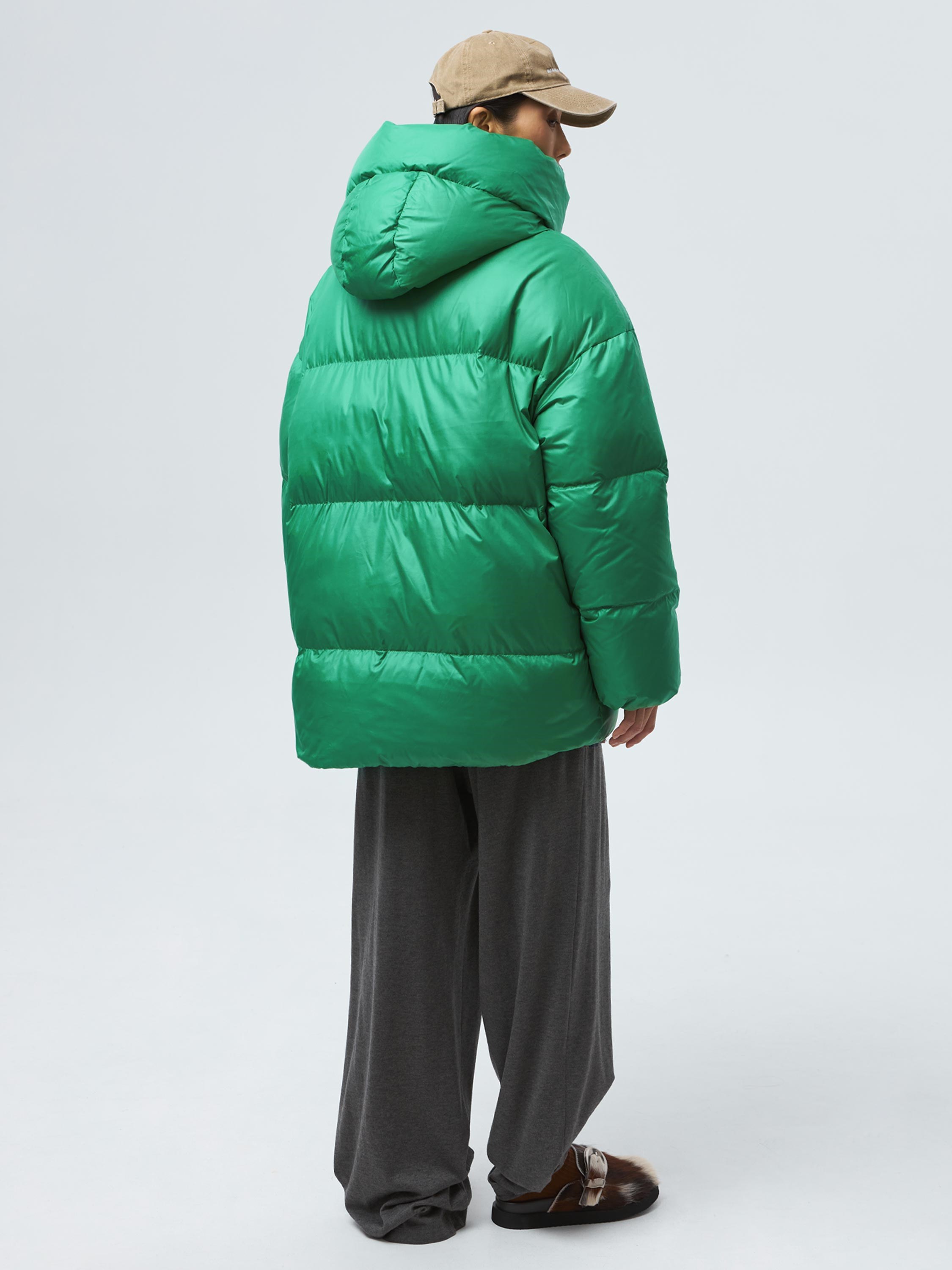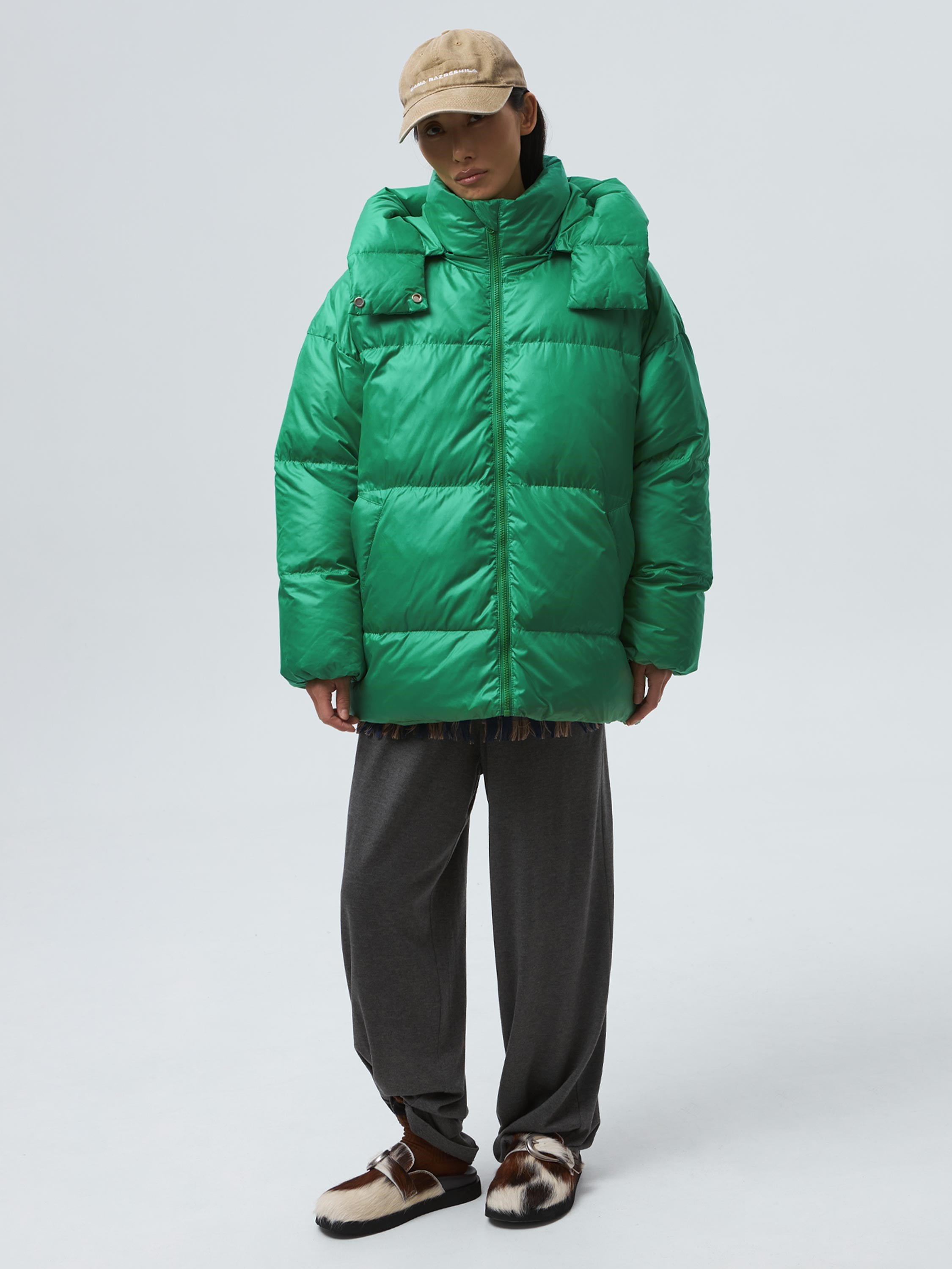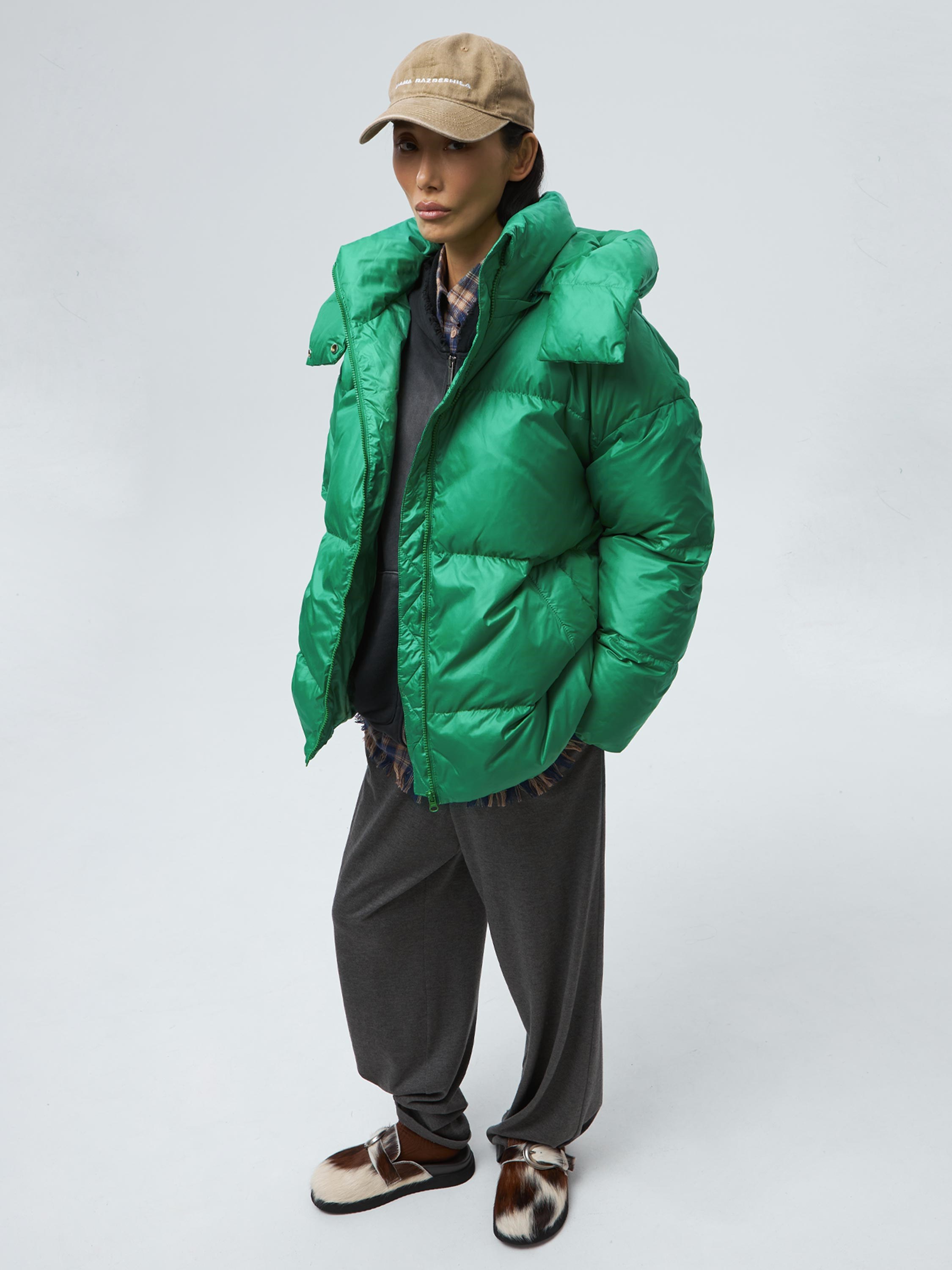 Модный пуховик из тонкой плащевой ткани (без дополнительного эффекта водоотталкивания) с отстёгивающимся капюшоном.