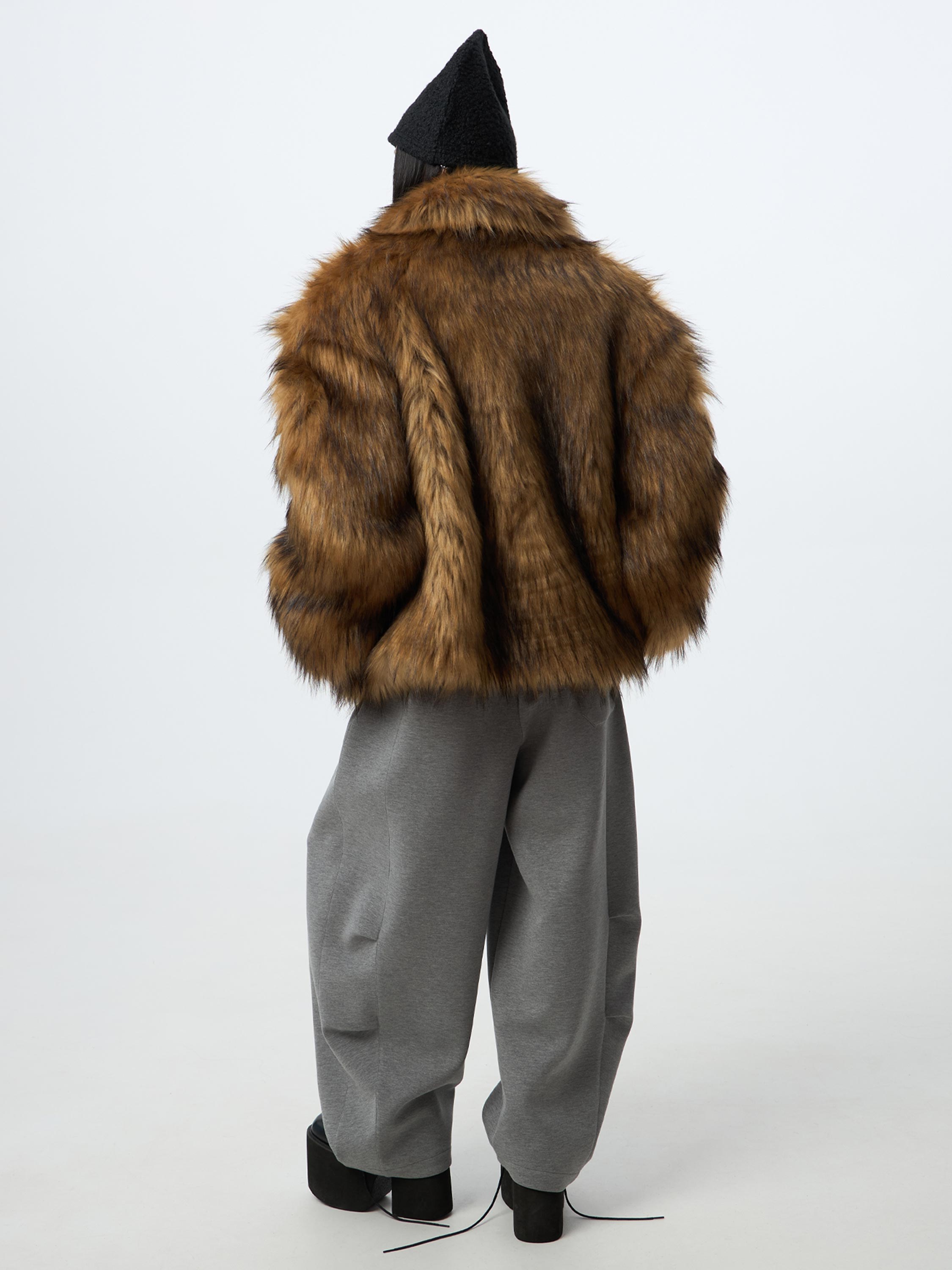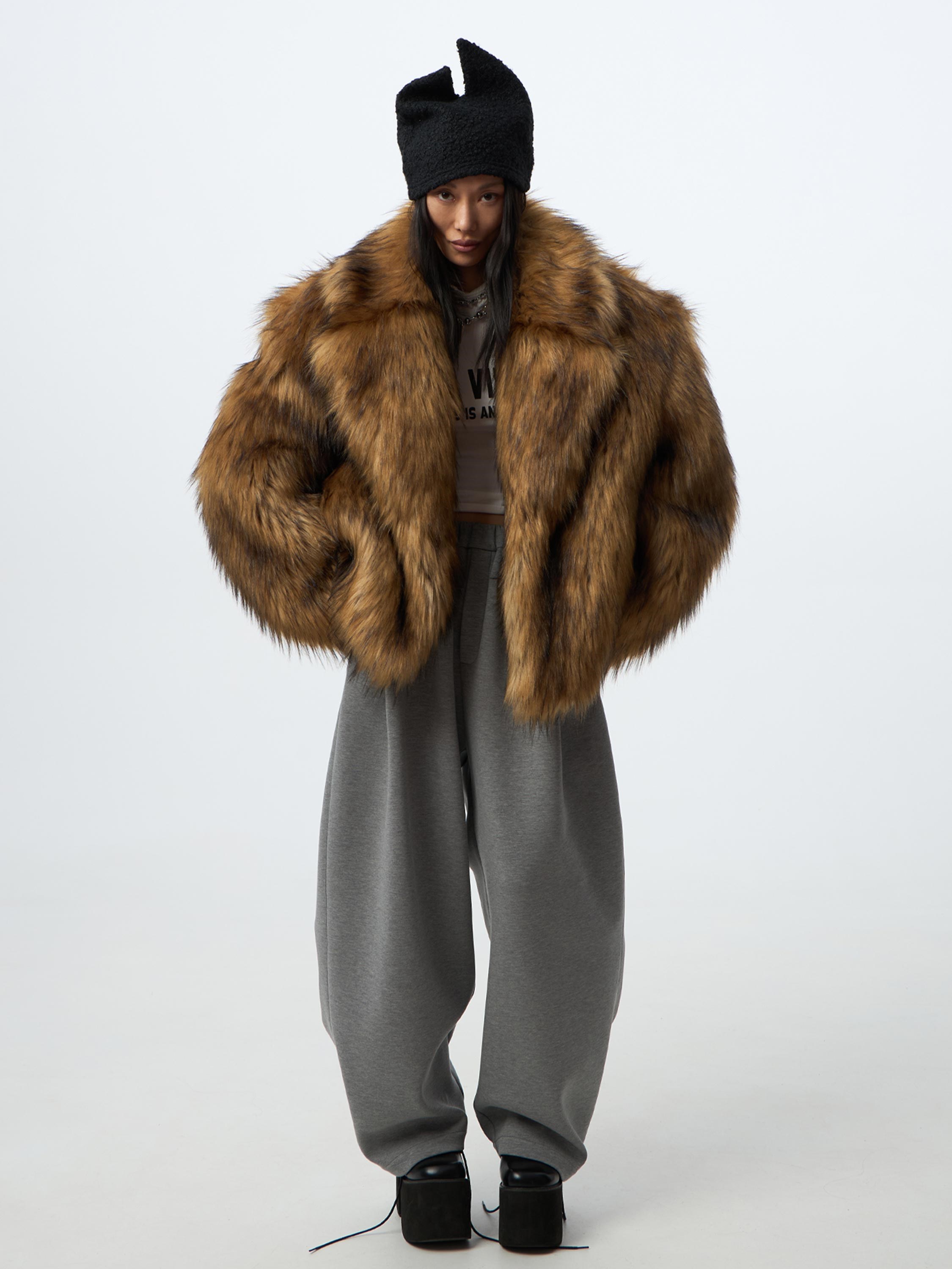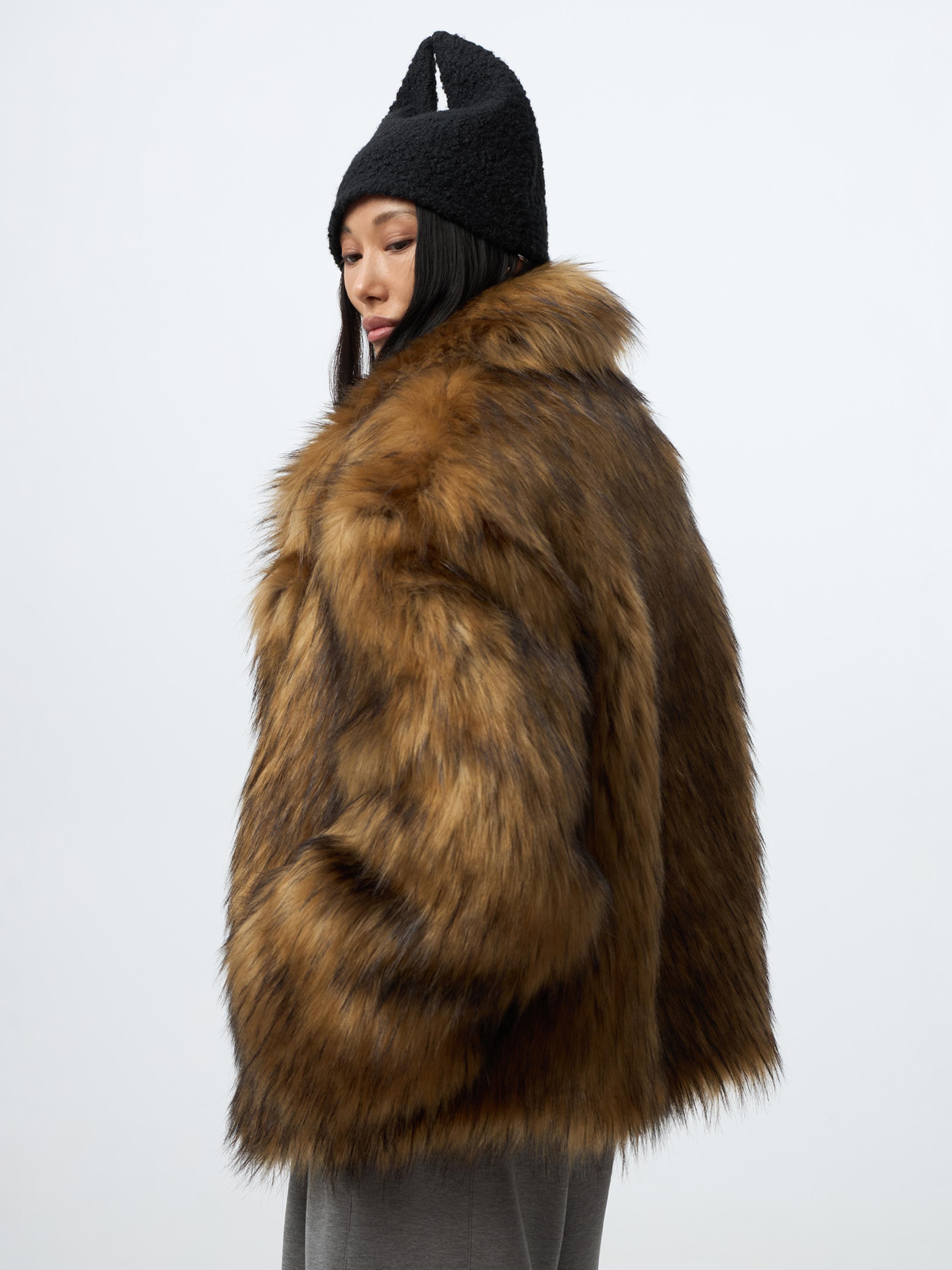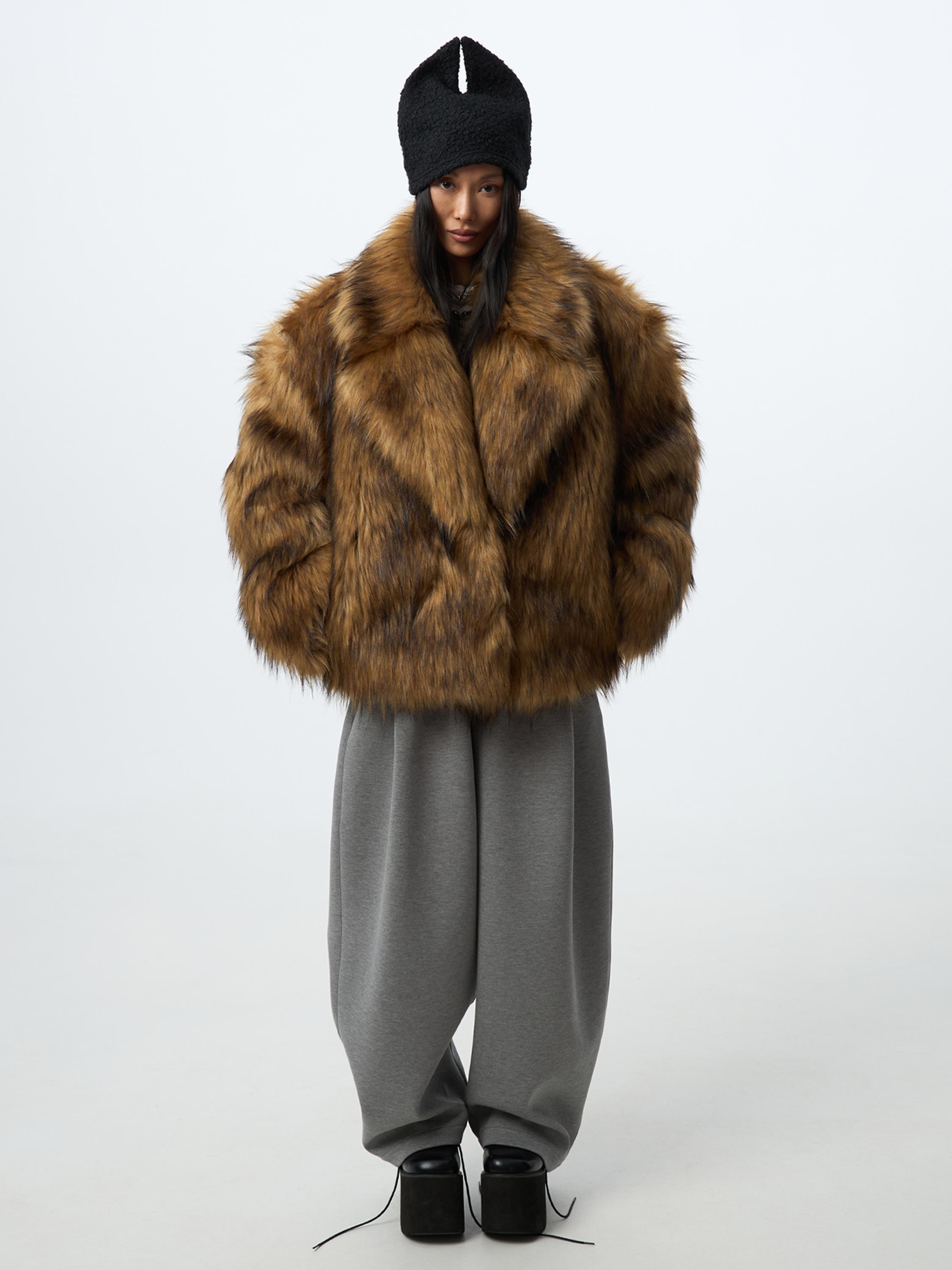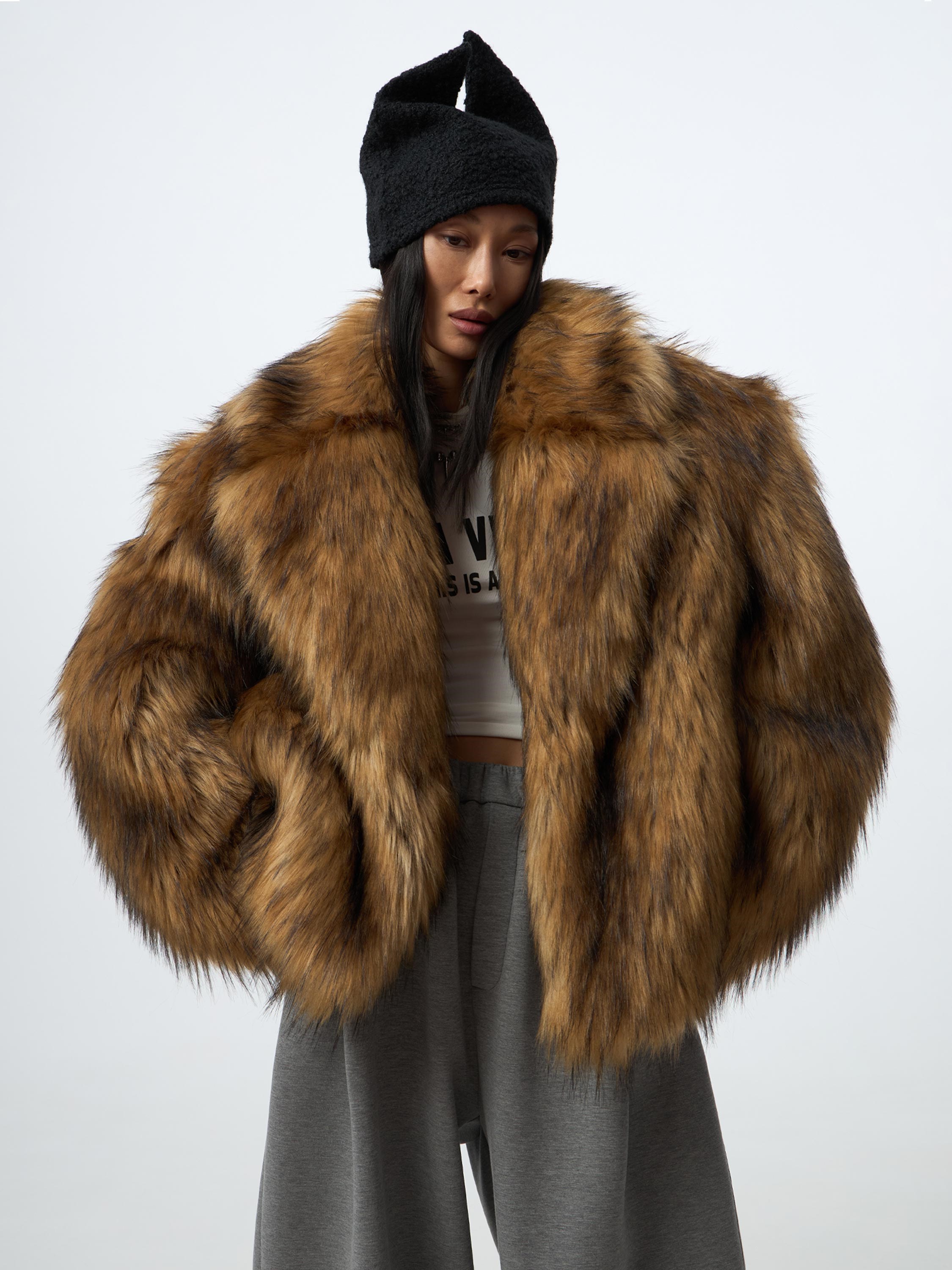 Укороченная шуба объёмного кроя из высококачественного искусственного меха. Густой ворс, напоминающий мех енота, имеет плотный подшёрсток, хорошо сохраняет тепло и устойчив к износу.